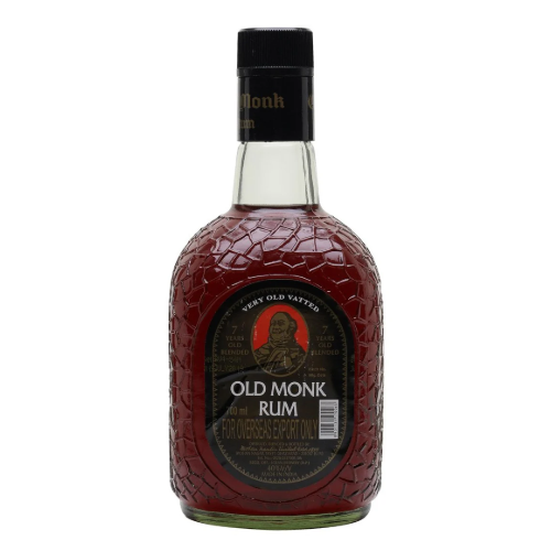 A 750ml bottle of Old Monk Rum – 7 Year Old Blended, known for its rich and complex rum profile with notes of dark fruit and spice.