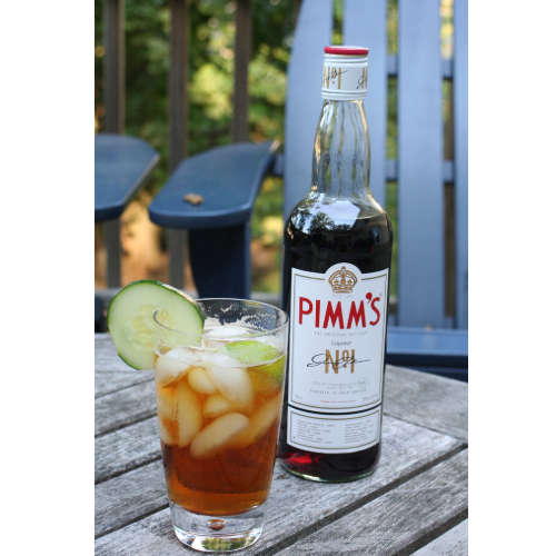 A 750ml bottle of Pimms No. 1 Cup, a classic British liqueur known for its rich and fruity flavor.