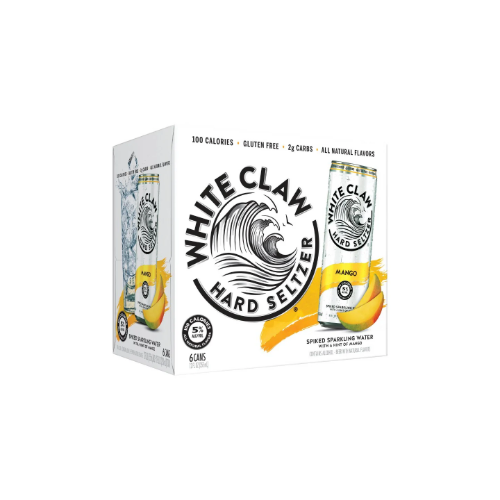 A 6-pack of White Claw Mango, known for its light and refreshing mango-flavored hard seltzer.